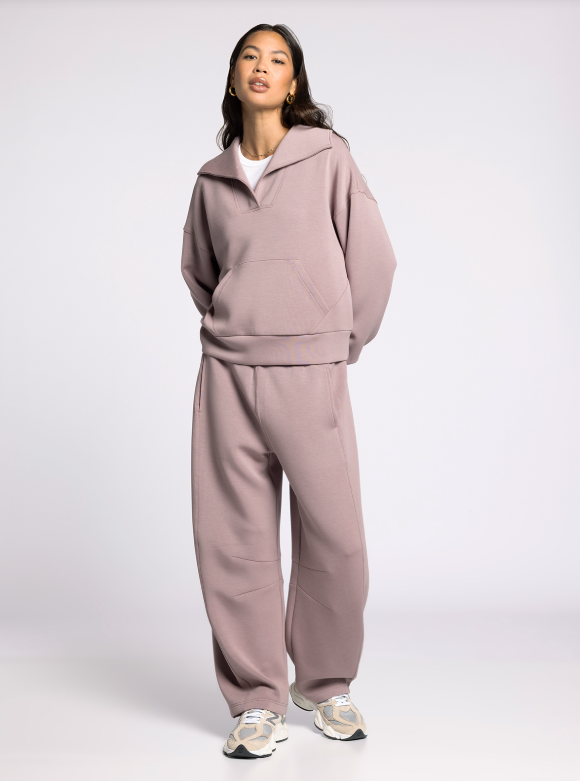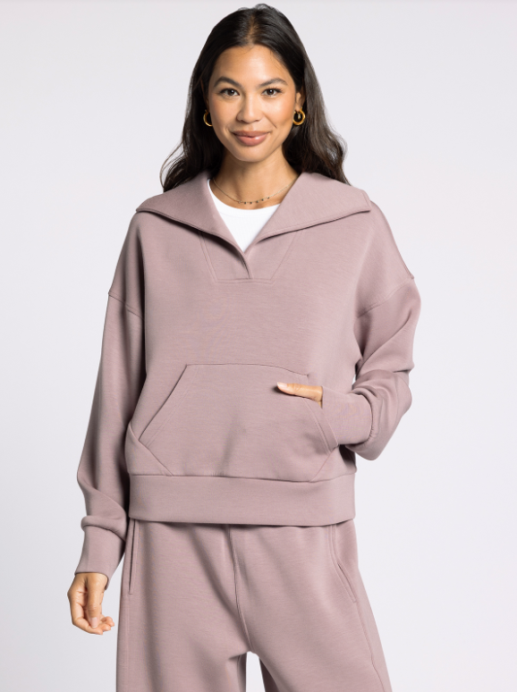 Polo V neck sweatshirt with front pocket and ribbed bottom. Great top with the matching sweat pants or with your jeans