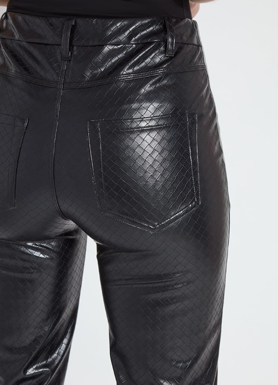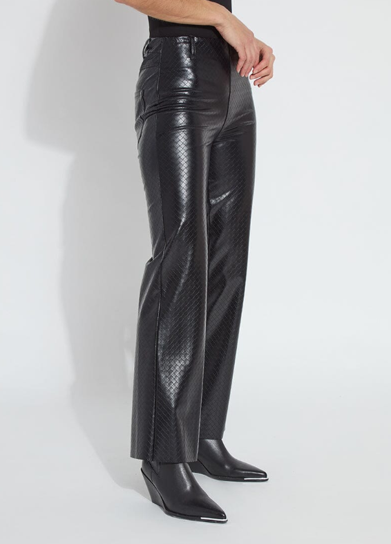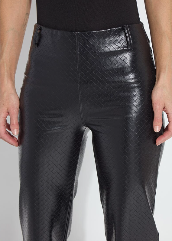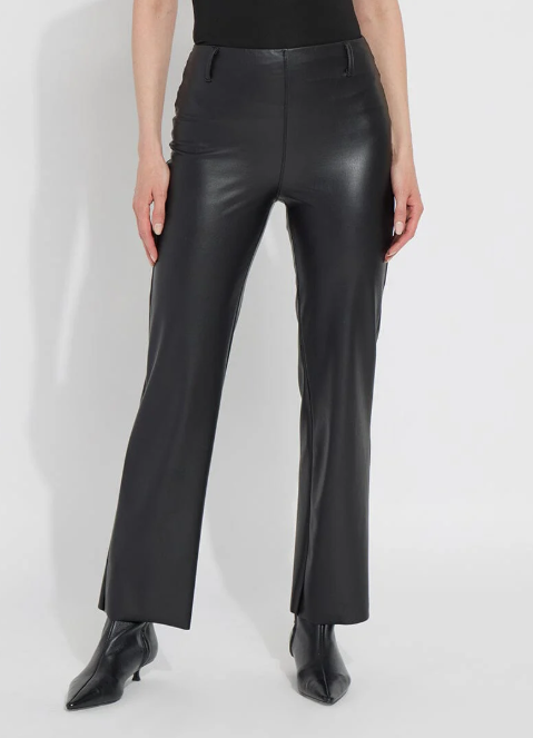 The Amara Straight Flare Pant offers a concealed patented waistband, wide, flared leg, flat front, back yoke, beltloops and pull-on styling. Made from 4-way stretch Lightweight Vegan Leather, the Amara Straight Flare Pant features a raw-edge hem for easy shortening. Partner these Faux Leather pants with our Crystal Embellished St Velvet Turtleneck and black boots.