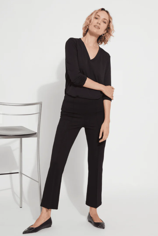 Offering a shorter, 27.5-inch inseam, the Ankle Elysse is the perfect fit-and-flare pant for shorter women. Made from 4-way stretch Ponte, the Ankle Elysse skims the hips and thighs before falling into a fit-and-flare leg. Showcasing a concealed patented waistband and front pintucks, the Ankle Elysse coordinates beautifully with tucked shirts