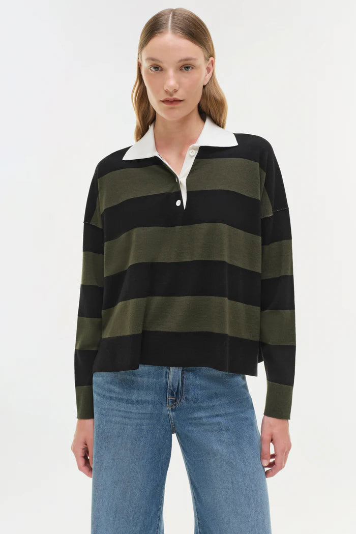 A featherweight wool rugby polo featuring a contrasting spread collar, long sleeves, and a boxy, cropped cut.