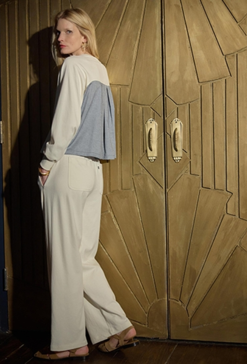 The Chambray Pleat Back Pullover is a fresh take on the everyday sweatshirt. Knit in a structured mid-weight jersey, it has a crew neck and rib trim cuffs. A pleated chambray panel in the back adds movement and a unique mixed-media detail. The relaxed fit and slightly shorter length make it easy to pair with the coordinating bottoms or your favorite denim.