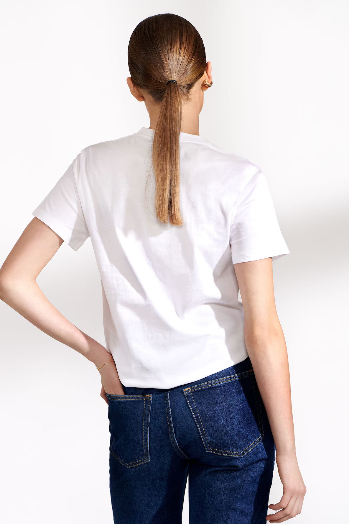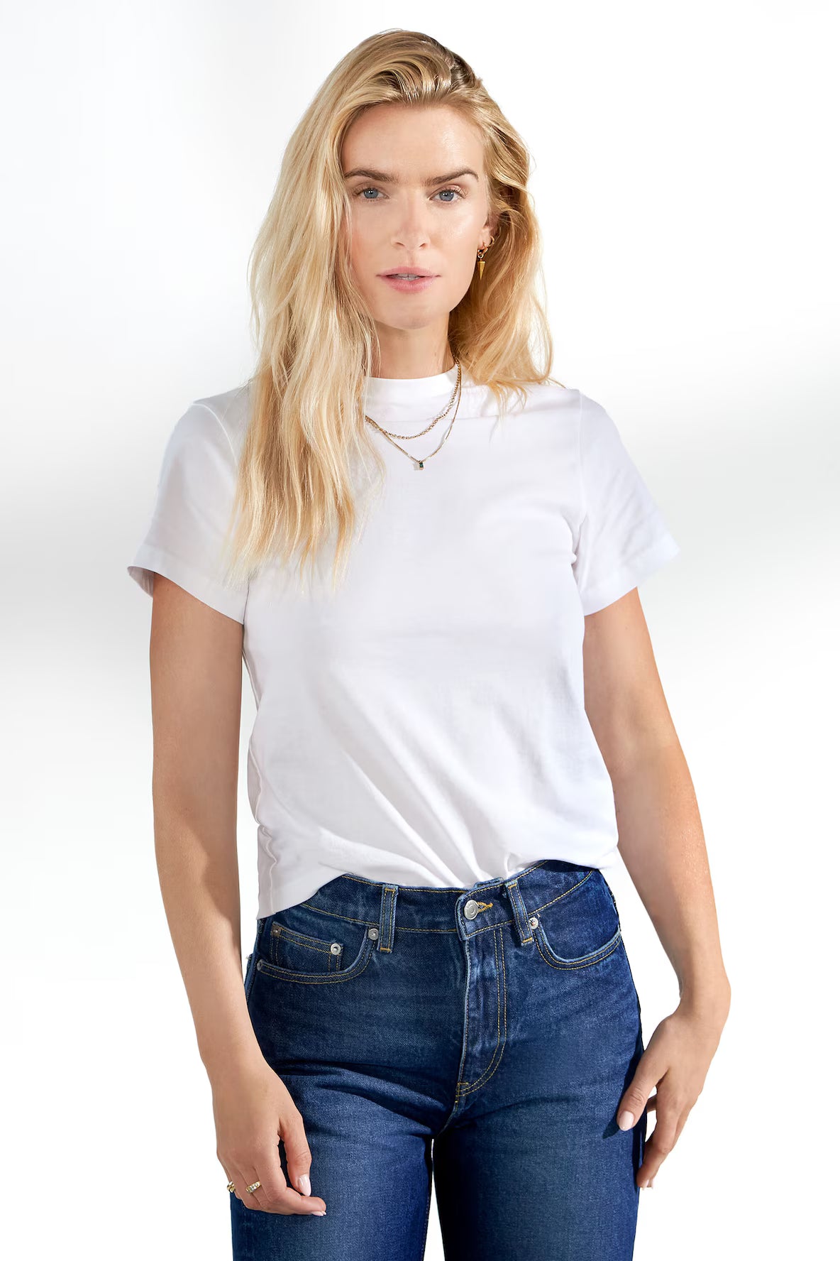 A modern classic with a high neck and boxy design. Made of dense, soft organic cotton which isn't see-through and is perfect for all occasions, whether you want to be sporty, casual or dressed up. Wear it tucked in or out. Concealed seam in the neckline and normal length sleeves.