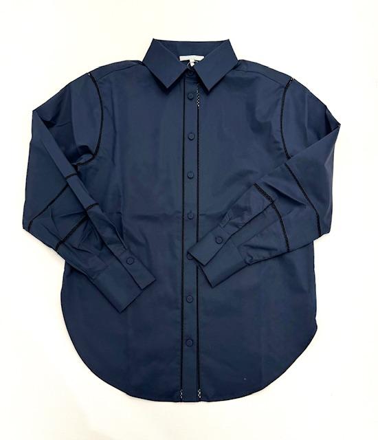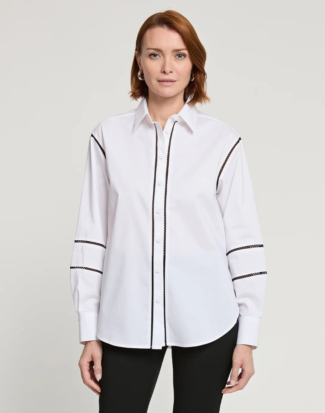 The Halsey is adorned with a striking black fagoting trim along the front placket and sleeves, adding a unique touch of texture and detail. The fabric-covered buttons blend seamlessly with the fabric, maintaining a sleek and polished look.