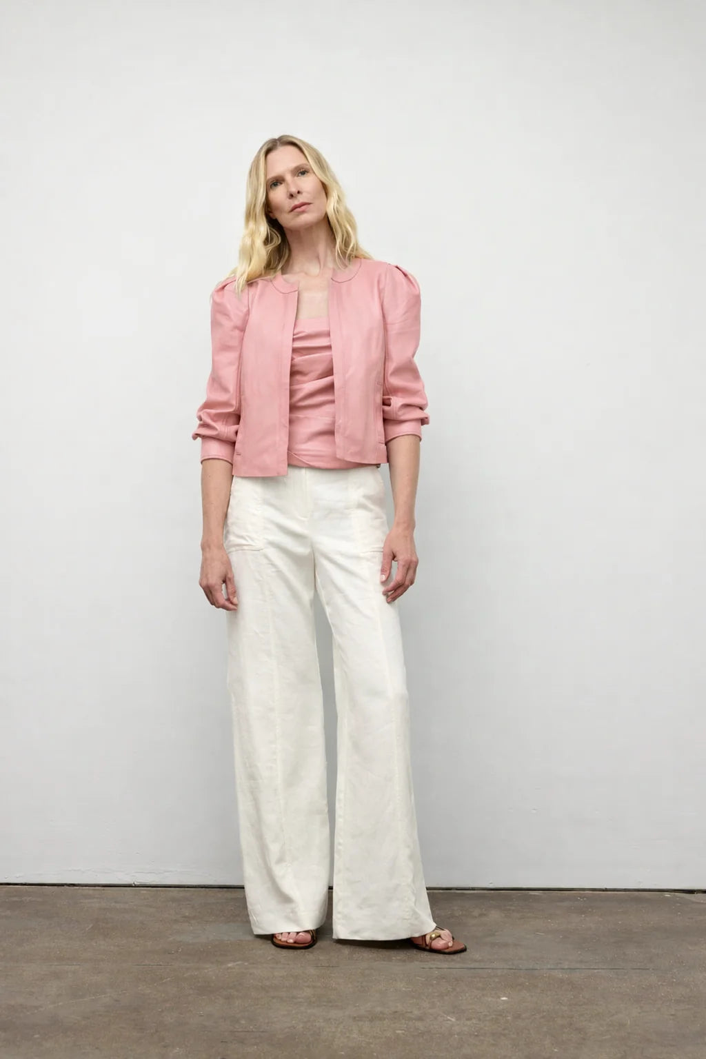 Collarless leather jacket with no closure. This timeless piece offers a flattering silhouette for every body shape, making it a versatile wardrobe essential.