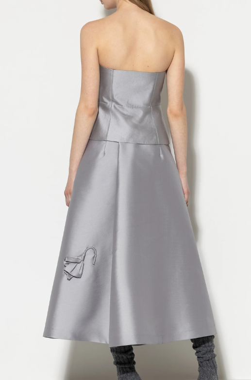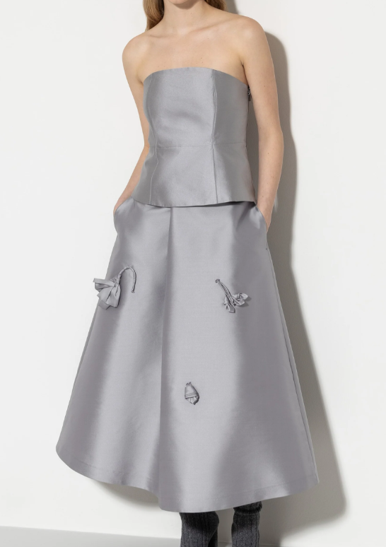 Long, extravagant skirt made from a matt twill/silk blend in an accentuated A-line silhouette with asymmetric pleat details. The lined skirt is intricately trimmed with handmade, three-dimensional flowers. The design features a soft mohair ribbon at the waistband.