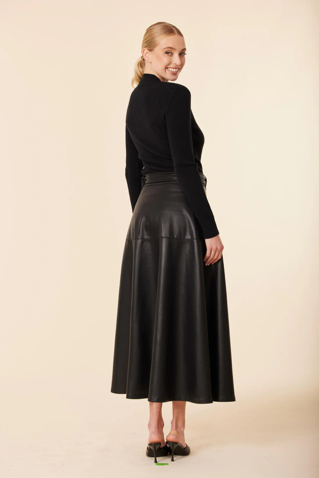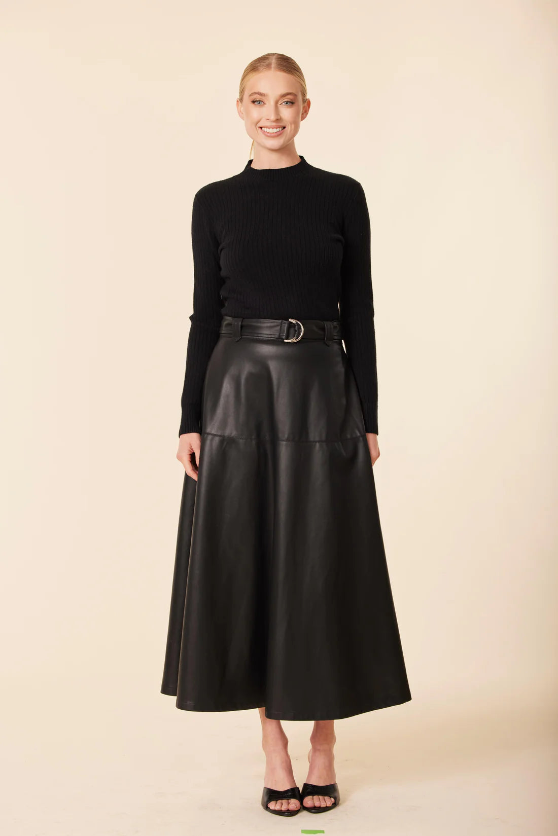 Make a statement with our sophisticated black faux leather A-line maxi dress, complete with a matching belt for a polished finish. The flowing silhouette and sleek texture make it a versatile women’s fall fashion piece, perfect for pairing with your favorite classic heels for day-to-night elegance.