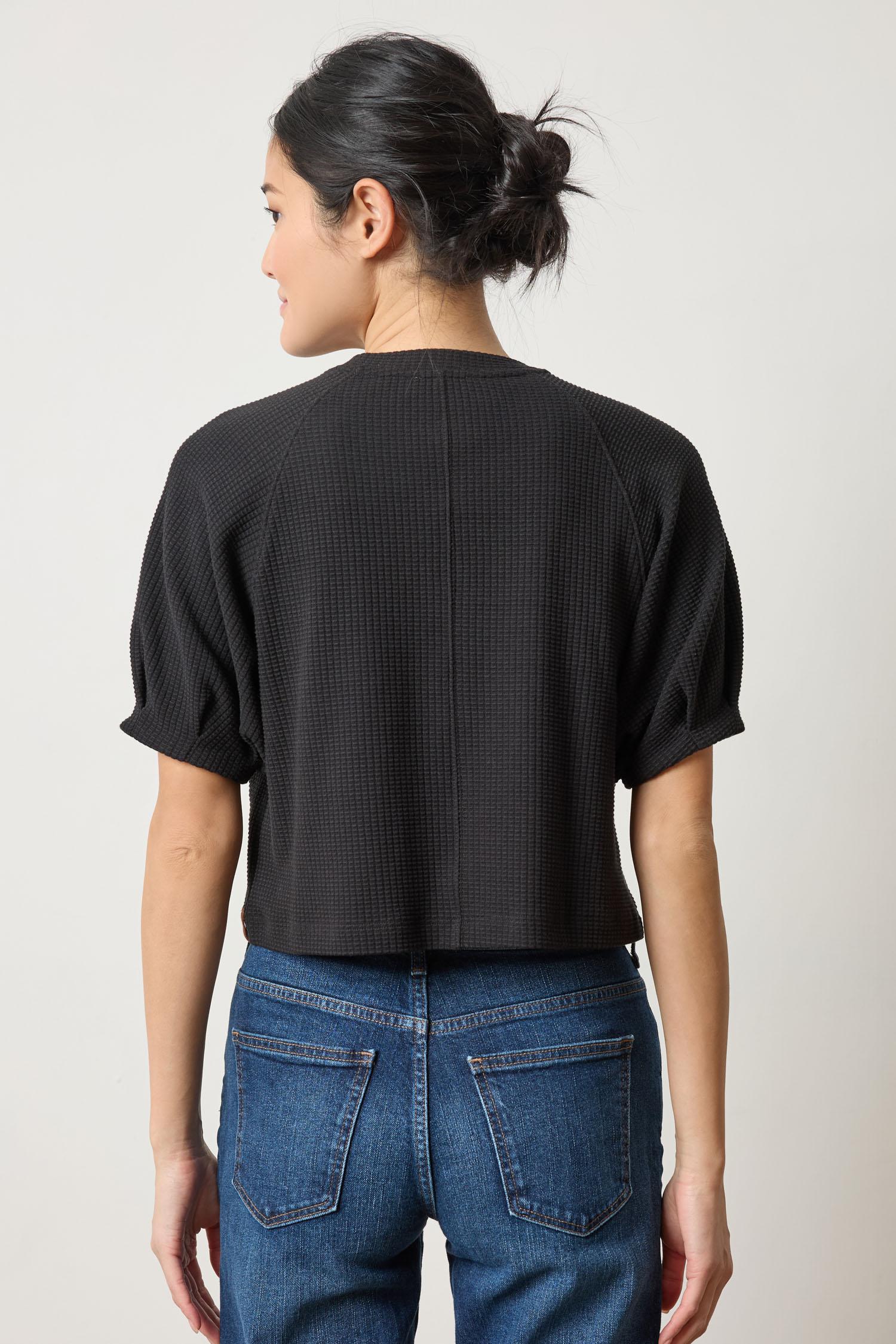 The Pleated Sleeve Top in our Textured Waffle, a customer favorite, has just the right amount of weight and a touch of stretch to hold its shape. The pleated sleeve opening adds a feminine, refined touch, while the shorter body length makes it the perfect match for the coordinating waffle pant. Casual yet elevated, this is the ideal set for running around town or travel while still looking put-together