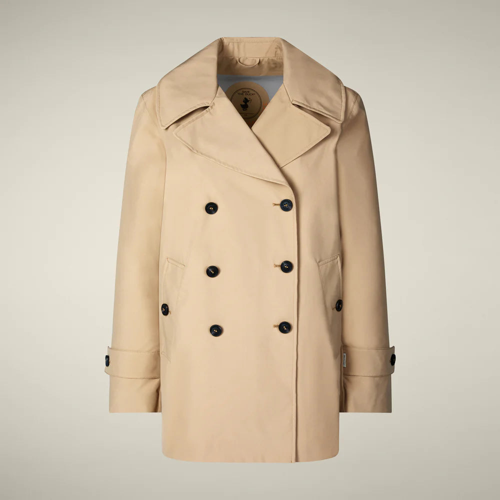 The Sofi model women’s rain jacket offers a fresh take on the classic peacoat, featuring a broad lapel. Light enough for warm-weather wear and easy to layer when the forecast turns colder, it’s made from a matte technical fabric with taped seams for added weather protection. The double-breasted front and adjustable wrist straps elevate the silhouette, while custom rubberized black buttons and a raised logo on the left sleeve add a distinctive Save The Duck touch.