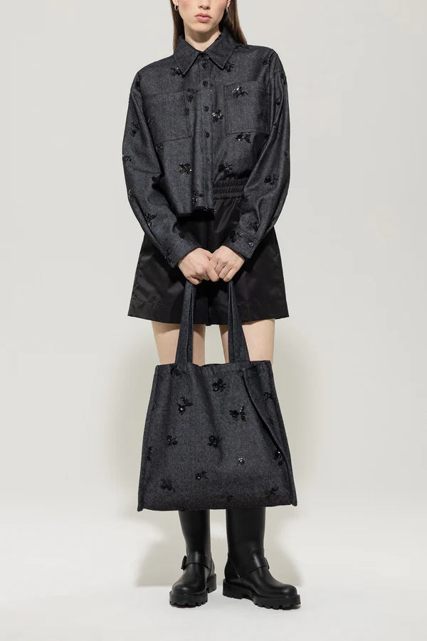 Short shirt made from rinse-wash denim with elaborate sequin embroidery and a full-length button placket. Two patch breast pockets and the open hemline complete the design.