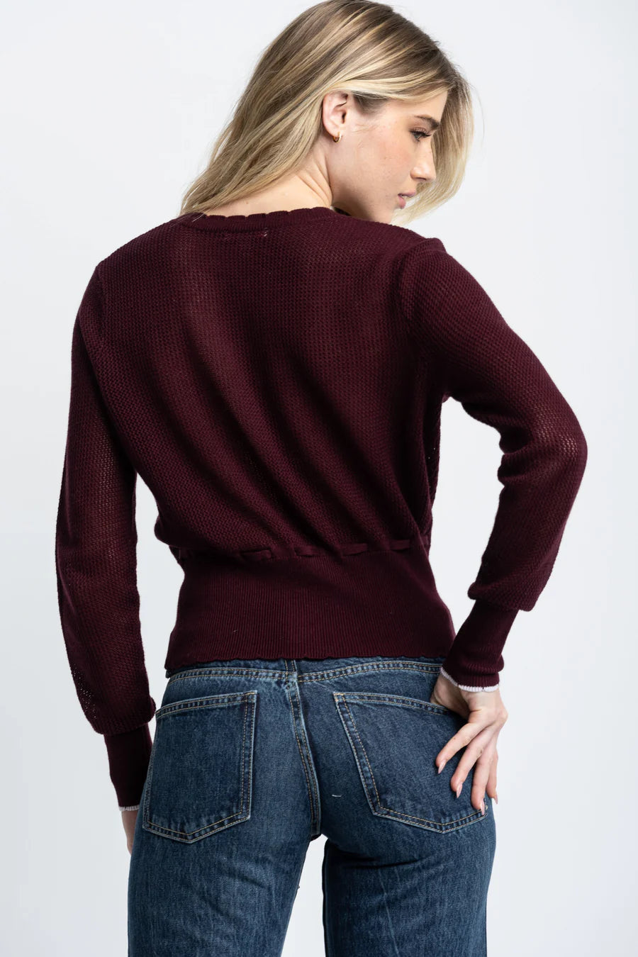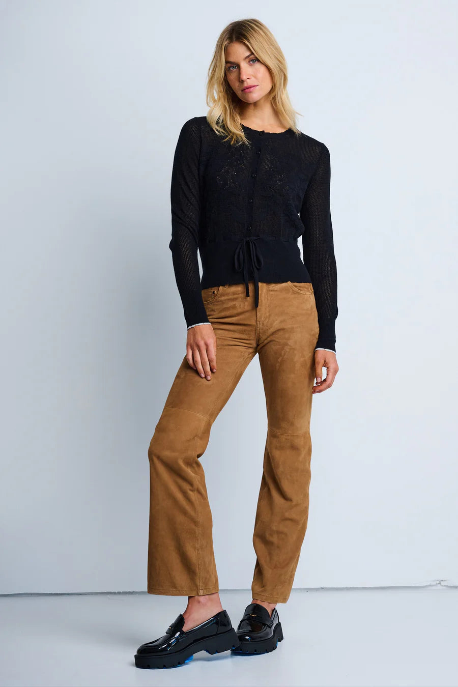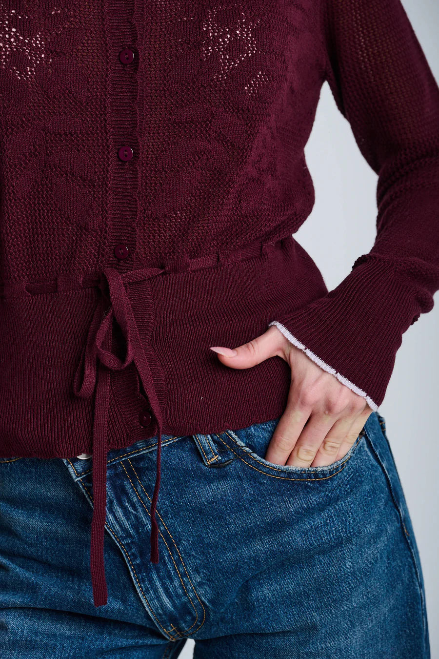 Feminine and refined, The Flirt cardigan features scalloped edging, floral intarsia, and an open-stitch texture. A slim fit silhouette, seven-button closure, and self-tie at the waist lend subtle definition. Crafted in a soft Cotton-Cashmere blend.
