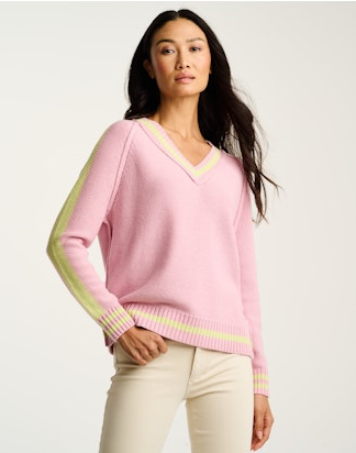 A classic V neck sweater with great bright bold stripes for the upcoming Spring season.