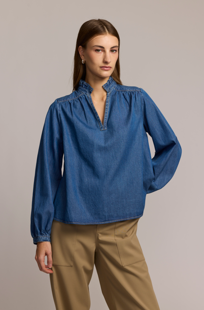 Everyones favorite denim is back with a fun V neck and ruffle for the new season